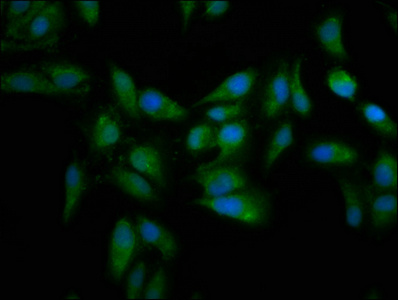 Immunofluorescence staining of Hela cells with CSB-PA04639A0Rb at 1:133, counter-stained with DAPI. The cells were fixed in 4% formaldehyde, permeabilized using 0.2% Triton X-100 and blocked in 10% normal Goat Serum. The cells were then incubated with the antibody overnight at 4°C. The secondary antibody was Alexa Fluor 488-congugated AffiniPure Goat Anti-Rabbit IgG(H+L).