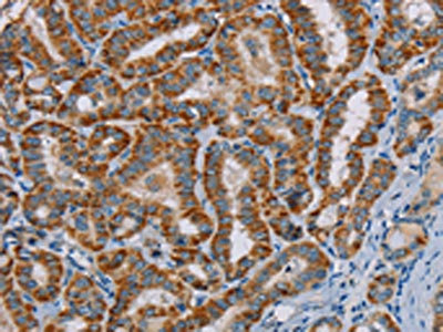The image on the left is immunohistochemistry of paraffin-embedded Human thyroid cancer tissue using CSB-PA083456(MTCH2 Antibody) at dilution 1/45, on the right is treated with fusion protein. (Original magnification: ×200)