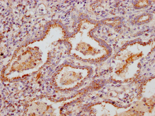 IHC image of CSB-PA875718LA01HU diluted at 1:300 and staining in paraffin-embedded human lung tissue performed on a Leica BondTM system. After dewaxing and hydration, antigen retrieval was mediated by high pressure in a citrate buffer (pH 6.0). Section was blocked with 10% normal goat serum 30min at RT. Then primary antibody (1% BSA) was incubated at 4°C overnight. The primary is detected by a Goat anti-rabbit polymer IgG labeled by HRP and visualized using 0.05% DAB.