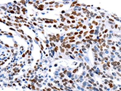 The image on the left is immunohistochemistry of paraffin-embedded Human lung cancer tissue using CSB-PA242639(MUTYH Antibody) at dilution 1/60, on the right is treated with fusion protein. (Original magnification: ×200)
