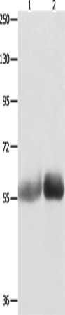 Gel: 8%SDS-PAGE, Lysate: 40 μg, Lane 1-2: Human liver cancer tissue, Human stomach cancer tissue, Primary antibody: CSB-PA242639(MUTYH Antibody) at dilution 1/1000, Secondary antibody: Goat anti rabbit IgG at 1/8000 dilution, Exposure time: 1 minute