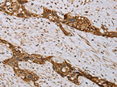 The image on the left is immunohistochemistry of paraffin-embedded Human esophagus cancer tissue using CSB-PA229254(MVK Antibody) at dilution 1/20, on the right is treated with fusion protein. (Original magnification: ×200)