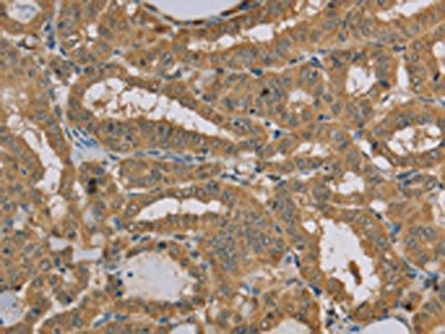 The image on the left is immunohistochemistry of paraffin-embedded Human thyroid cancer tissue using CSB-PA229254(MVK Antibody) at dilution 1/20, on the right is treated with fusion protein. (Original magnification: ×200)