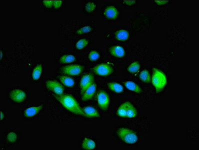 Immunofluorescent analysis of A549 cells using CSB-PA015258LA01HU at dilution of 1:100 and Alexa Fluor 488-congugated AffiniPure Goat Anti-Rabbit IgG(H+L)