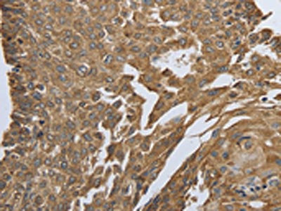 The image on the left is immunohistochemistry of paraffin-embedded Human cervical cancer tissue using CSB-PA697034(MYH11 Antibody) at dilution 1/25, on the right is treated with synthetic peptide. (Original magnification: ×200)