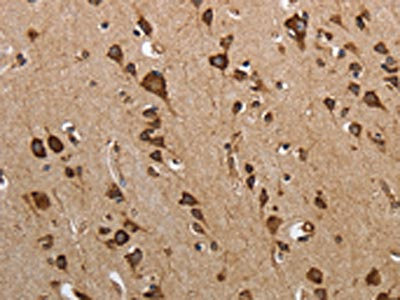 The image on the left is immunohistochemistry of paraffin-embedded Human brain tissue using CSB-PA697034(MYH11 Antibody) at dilution 1/25, on the right is treated with synthetic peptide. (Original magnification: ×200)