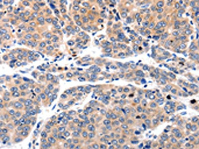 The image on the left is immunohistochemistry of paraffin-embedded Human liver cancer tissue using CSB-PA151831(MYL9 Antibody) at dilution 1/80, on the right is treated with synthetic peptide. (Original magnification: ×200)