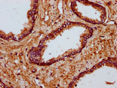 IHC image of CSB-PA621526LA01HU diluted at 1:700 and staining in paraffin-embedded human prostate tissue performed on a Leica BondTM system. After dewaxing and hydration, antigen retrieval was mediated by high pressure in a citrate buffer (pH 6.0). Section was blocked with 10% normal goat serum 30min at RT. Then primary antibody (1% BSA) was incubated at 4°C overnight. The primary is detected by a biotinylated secondary antibody and visualized using an HRP conjugated SP system.