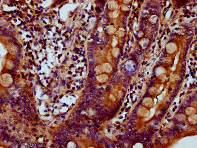 IHC image of CSB-PA621526LA01HU diluted at 1:700 and staining in paraffin-embedded human small intestine tissue performed on a Leica BondTM system. After dewaxing and hydration, antigen retrieval was mediated by high pressure in a citrate buffer (pH 6.0). Section was blocked with 10% normal goat serum 30min at RT. Then primary antibody (1% BSA) was incubated at 4°C overnight. The primary is detected by a biotinylated secondary antibody and visualized using an HRP conjugated SP system.