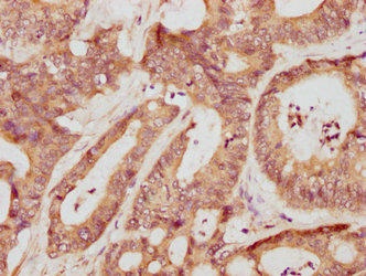 IHC image of CSB-PA17509A0Rb diluted at 1:709 and staining in paraffin-embedded human colon cancer performed on a Leica BondTM system. After dewaxing and hydration, antigen retrieval was mediated by high pressure in a citrate buffer (pH 6.0). Section was blocked with 10% normal goat serum 30min at RT. Then primary antibody (1% BSA) was incubated at 4°C overnight. The primary is detected by a biotinylated secondary antibody and visualized using an HRP conjugated SP system.