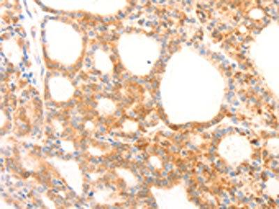 The image on the left is immunohistochemistry of paraffin-embedded Human thyroid cancer tissue using CSB-PA903058(NAP1L1 Antibody) at dilution 1/70, on the right is treated with fusion protein. (Original magnification: ×200)