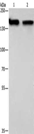 Gel: 6%SDS-PAGE, Lysate: 40 μg, Lane 1-2: 293T cells, hela cells, Primary antibody: CSB-PA628649(NCAPD2 Antibody) at dilution 1/425, Secondary antibody: Goat anti rabbit IgG at 1/8000 dilution, Exposure time: 20 seconds