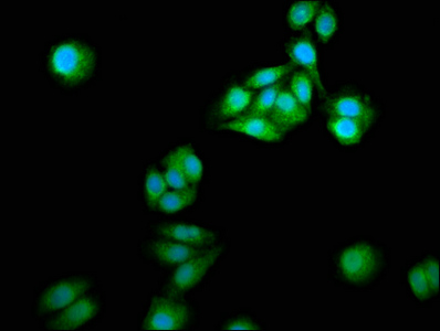 Immunofluorescence staining of HepG2 cells with CSB-PA015524LA01HU at 1:166, counter-stained with DAPI. The cells were fixed in 4% formaldehyde, permeabilized using 0.2% Triton X-100 and blocked in 10% normal Goat Serum. The cells were then incubated with the antibody overnight at 4°C. The secondary antibody was Alexa Fluor 488-congugated AffiniPure Goat Anti-Rabbit IgG(H+L).