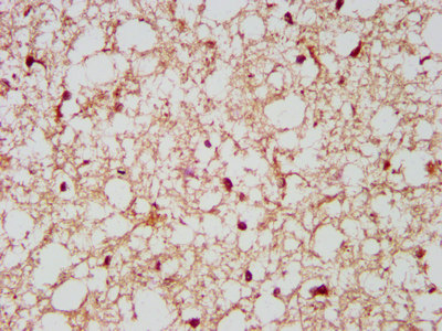 IHC image of CSB-PA015524LA01HU diluted at 1:500 and staining in paraffin-embedded human brain tissue performed on a Leica BondTM system. After dewaxing and hydration, antigen retrieval was mediated by high pressure in a citrate buffer (pH 6.0). Section was blocked with 10% normal goat serum 30min at RT. Then primary antibody (1% BSA) was incubated at 4°C overnight. The primary is detected by a biotinylated secondary antibody and visualized using an HRP conjugated SP system.