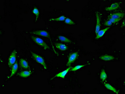 Immunofluorescent analysis of Hela cells using CSB-PA015525LA01HU at dilution of 1:100 and Alexa Fluor 488-congugated AffiniPure Goat Anti-Rabbit IgG(H+L)