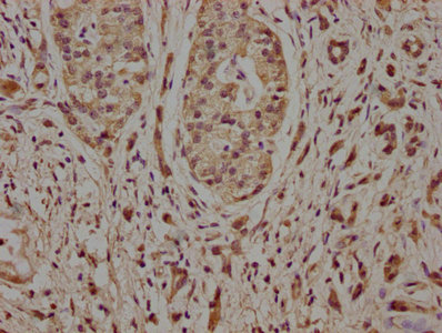 IHC image of CSB-PA822169LA01HU diluted at 1:100 and staining in paraffin-embedded human pancreatic cancer performed on a Leica BondTM system. After dewaxing and hydration, antigen retrieval was mediated by high pressure in a citrate buffer (pH 6.0). Section was blocked with 10% normal goat serum 30min at RT. Then primary antibody (1% BSA) was incubated at 4°C overnight. The primary is detected by a biotinylated secondary antibody and visualized using an HRP conjugated SP system.