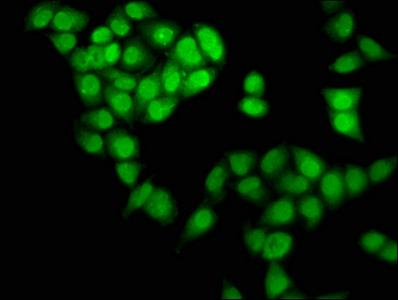 Immunofluorescence staining of Hela cells with CSB-PA859515LA01HU at 1:133, counter-stained with DAPI. The cells were fixed in 4% formaldehyde, permeabilized using 0.2% Triton X-100 and blocked in 10% normal Goat Serum. The cells were then incubated with the antibody overnight at 4°C. The secondary antibody was Alexa Fluor 488-congugated AffiniPure Goat Anti-Rabbit IgG(H+L).