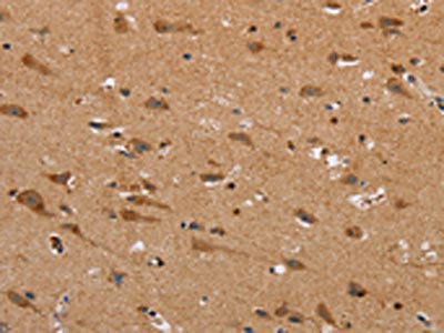 The image on the left is immunohistochemistry of paraffin-embedded Human brain tissue using CSB-PA078815(NDRG3 Antibody) at dilution 1/40, on the right is treated with synthetic peptide. (Original magnification: ×200)
