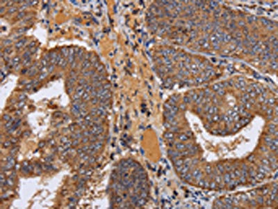 The image on the left is immunohistochemistry of paraffin-embedded Human colon cancer tissue using CSB-PA220820(NDUFA1 Antibody) at dilution 1/70, on the right is treated with fusion protein. (Original magnification: ×200)