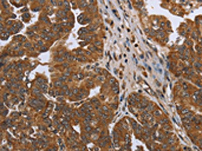 The image on the left is immunohistochemistry of paraffin-embedded Human ovarian cancer tissue using CSB-PA211169(NDUFAF4 Antibody) at dilution 1/50, on the right is treated with synthetic peptide. (Original magnification: ×200)