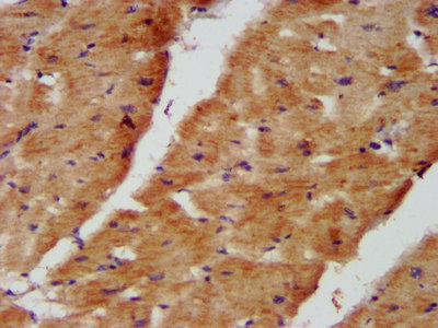 IHC image of CSB-PA015655LA01HU diluted at 1:400 and staining in paraffin-embedded human heart tissue performed on a Leica BondTM system. After dewaxing and hydration, antigen retrieval was mediated by high pressure in a citrate buffer (pH 6.0). Section was blocked with 10% normal goat serum 30min at RT. Then primary antibody (1% BSA) was incubated at 4°C overnight. The primary is detected by a biotinylated secondary antibody and visualized using an HRP conjugated SP system.