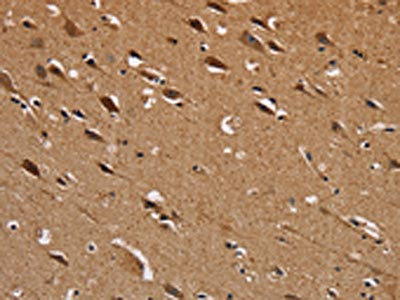 The image on the left is immunohistochemistry of paraffin-embedded Human brain tissue using CSB-PA227378(NDUFS1 Antibody) at dilution 1/50, on the right is treated with fusion protein. (Original magnification: ×200)