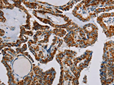 The image on the left is immunohistochemistry of paraffin-embedded Human thyroid cancer tissue using CSB-PA197280(NDUFS3 Antibody) at dilution 1/30, on the right is treated with fusion protein. (Original magnification: ×200)