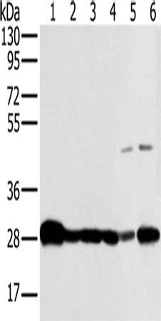 Gel: 8%SDS-PAGE, Lysate: 40 μg, Lane 1-6: Mouse brain tissue, human fetal brain tissue, hela cells, Raw264.7 cells, NIH/3T3 cells, 293T cells, Primary antibody: CSB-PA197280(NDUFS3 Antibody) at dilution 1/300, Secondary antibody: Goat anti rabbit IgG at 1/8000 dilution, Exposure time: 5 seconds
