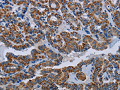 The image on the left is immunohistochemistry of paraffin-embedded Human thyroid cancer tissue using CSB-PA193298(NDUFS8 Antibody) at dilution 1/20, on the right is treated with fusion protein. (Original magnification: ×200)