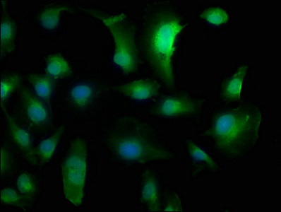 Immunofluorescence staining of U251 cells with CSB-PA843298LA01HU at 1:133, counter-stained with DAPI. The cells were fixed in 4% formaldehyde, permeabilized using 0.2% Triton X-100 and blocked in 10% normal Goat Serum. The cells were then incubated with the antibody overnight at 4°C. The secondary antibody was Alexa Fluor 488-congugated AffiniPure Goat Anti-Rabbit IgG(H+L).