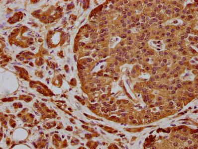 IHC image of CSB-PA747816LA01HU diluted at 1:300 and staining in paraffin-embedded human pancreatic cancer performed on a Leica BondTM system. After dewaxing and hydration, antigen retrieval was mediated by high pressure in a citrate buffer (pH 6.0). Section was blocked with 10% normal goat serum 30min at RT. Then primary antibody (1% BSA) was incubated at 4°C overnight. The primary is detected by a biotinylated secondary antibody and visualized using an HRP conjugated SP system.