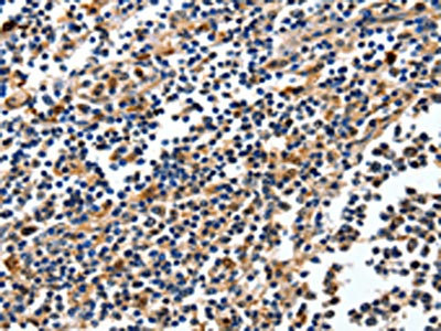 The image on the left is immunohistochemistry of paraffin-embedded Human tonsil tissue using CSB-PA173796(NFKBID Antibody) at dilution 1/25, on the right is treated with fusion protein. (Original magnification: ×200)