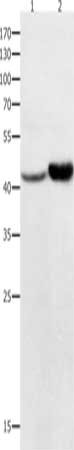 Gel: 10+12%SDS-PAGE, Lysate: 40 μg, Lane 1-2: Hela cells, 231 cells, Primary antibody: CSB-PA173796(NFKBID Antibody) at dilution 1/450, Secondary antibody: Goat anti rabbit IgG at 1/8000 dilution, Exposure time: 2 minutes