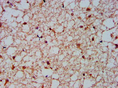 IHC image of CSB-PA887001LA01HU diluted at 1:600 and staining in paraffin-embedded human brain tissue performed on a Leica BondTM system. After dewaxing and hydration, antigen retrieval was mediated by high pressure in a citrate buffer (pH 6.0). Section was blocked with 10% normal goat serum 30min at RT. Then primary antibody (1% BSA) was incubated at 4°C overnight. The primary is detected by a biotinylated secondary antibody and visualized using an HRP conjugated SP system.