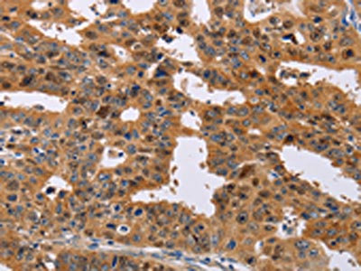 The image on the left is immunohistochemistry of paraffin-embedded Human gastic cancer tissue using CSB-PA061258(NIF3L1 Antibody) at dilution 1/30, on the right is treated with fusion protein. (Original magnification: ×200)