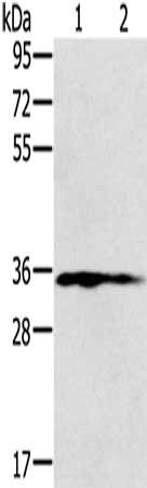 Gel: 8%SDS-PAGE, Lysate: 40 μg, Lane 1-2: Human placenta tissue, Human fetal liver tissue, Primary antibody: CSB-PA570196(NIT1 Antibody) at dilution 1/250, Secondary antibody: Goat anti rabbit IgG at 1/8000 dilution, Exposure time: 2 minutes