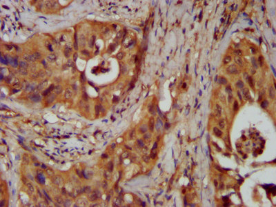 IHC image of CSB-PA015847LA01HU diluted at 1:300 and staining in paraffin-embedded human cervical cancer performed on a Leica BondTM system. After dewaxing and hydration, antigen retrieval was mediated by high pressure in a citrate buffer (pH 6.0). Section was blocked with 10% normal goat serum 30min at RT. Then primary antibody (1% BSA) was incubated at 4°C overnight. The primary is detected by a biotinylated secondary antibody and visualized using an HRP conjugated SP system.