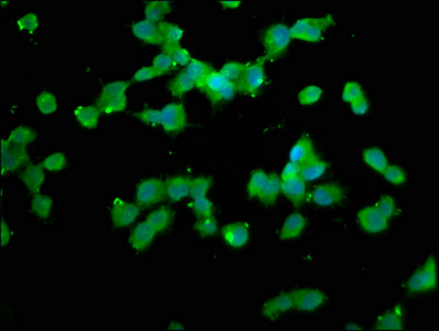 Immunofluorescence staining of SH-SY5Y cells with CSB-PA871630EA01HU at 1:133, counter-stained with DAPI. The cells were fixed in 4% formaldehyde, permeabilized using 0.2% Triton X-100 and blocked in 10% normal Goat Serum. The cells were then incubated with the antibody overnight at 4°C. The secondary antibody was Alexa Fluor 488-congugated AffiniPure Goat Anti-Rabbit IgG(H+L).