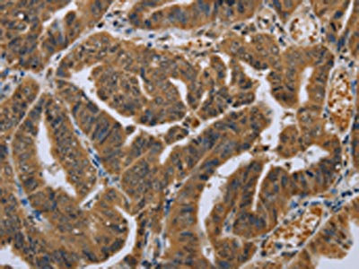 The image on the left is immunohistochemistry of paraffin-embedded Human colon cancer tissue using CSB-PA207849(NLRP10 Antibody) at dilution 1/45, on the right is treated with synthetic peptide. (Original magnification: ×200)