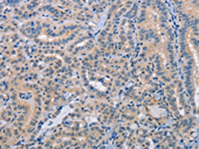 The image on the left is immunohistochemistry of paraffin-embedded Human thyroid cancer tissue using CSB-PA084492(NLRP3 Antibody) at dilution 1/15, on the right is treated with fusion protein. (Original magnification: ×200)