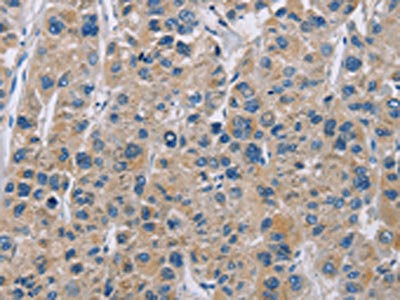 The image on the left is immunohistochemistry of paraffin-embedded Human liver cancer tissue using CSB-PA876464(NME5 Antibody) at dilution 1/50, on the right is treated with fusion protein. (Original magnification: ×200)