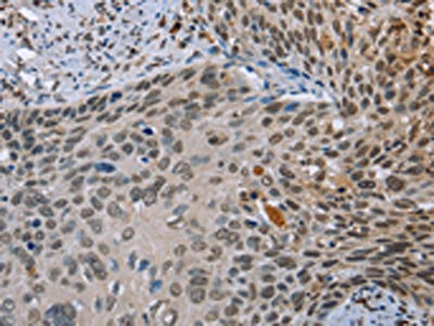 The image on the left is immunohistochemistry of paraffin-embedded Human cervical cancer tissue using CSB-PA557232(NMT1 Antibody) at dilution 1/45, on the right is treated with synthetic peptide. (Original magnification: ×200)