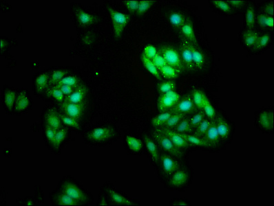 Immunofluorescence staining of HepG2 cells with CSB-PA015921HA01HU at 1:266, counter-stained with DAPI. The cells were fixed in 4% formaldehyde, permeabilized using 0.2% Triton X-100 and blocked in 10% normal Goat Serum. The cells were then incubated with the antibody overnight at 4°C. The secondary antibody was Alexa Fluor 488-congugated AffiniPure Goat Anti-Rabbit IgG(H+L).