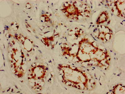 IHC image of CSB-PA015921HA01HU diluted at 1:800 and staining in paraffin-embedded human breast cancer performed on a Leica BondTM system. After dewaxing and hydration, antigen retrieval was mediated by high pressure in a citrate buffer (pH 6.0). Section was blocked with 10% normal goat serum 30min at RT. Then primary antibody (1% BSA) was incubated at 4°C overnight. The primary is detected by a biotinylated secondary antibody and visualized using an HRP conjugated SP system.