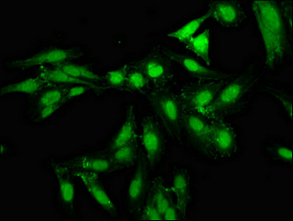 Immunofluorescence staining of Hela cells with CSB-PA860777LA01HU at 1:133, counter-stained with DAPI. The cells were fixed in 4% formaldehyde, permeabilized using 0.2% Triton X-100 and blocked in 10% normal Goat Serum. The cells were then incubated with the antibody overnight at 4°C. The secondary antibody was Alexa Fluor 488-congugated AffiniPure Goat Anti-Rabbit IgG(H+L).