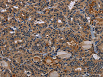 The image on the left is immunohistochemistry of paraffin-embedded Human thyroid cancer tissue using CSB-PA062668(NPRL2 Antibody) at dilution 1/50, on the right is treated with synthetic peptide. (Original magnification: ×200)