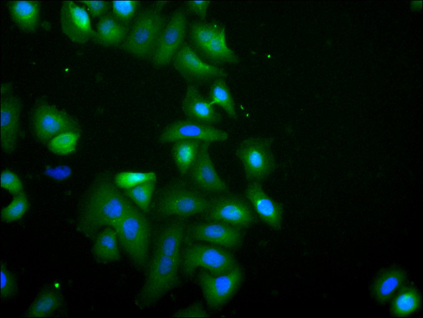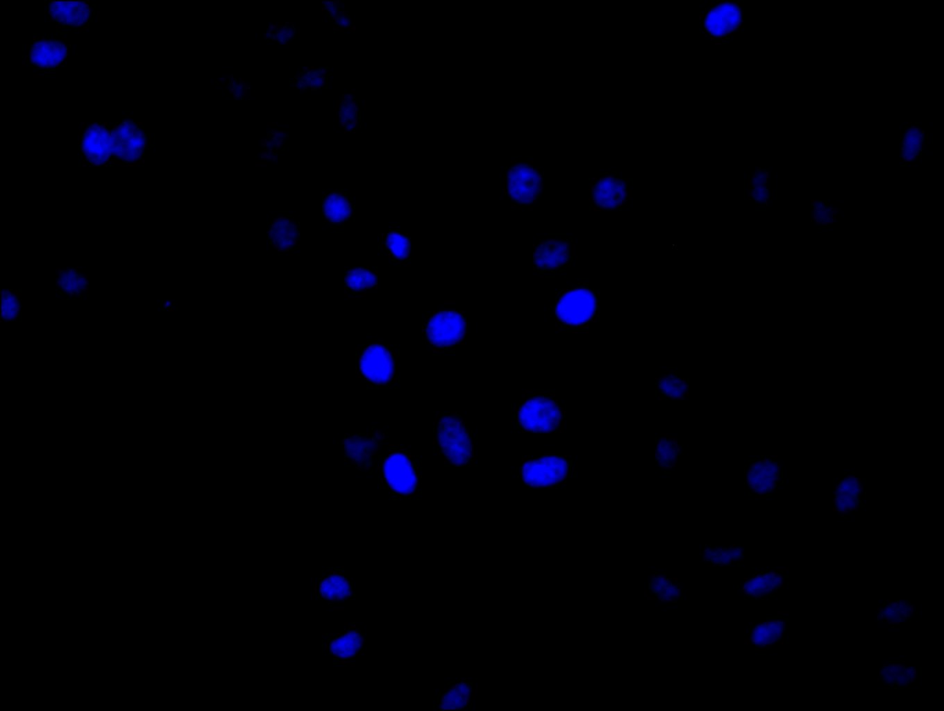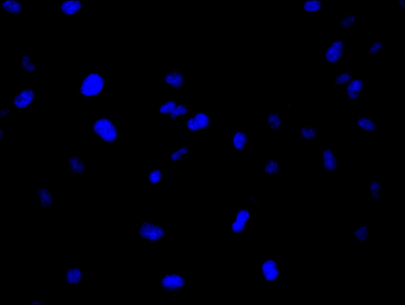 Immunofluorescence stainingof Hela cell with CSB-PA016040LA01HU at 1:20, counter-stained with DAPI. The cells were fixed in 4% formaldehyde and blocked in 10% normal Goat Serum. The cells were then incubated with the antibody overnight at 4C. The secondary antibody was Alexa Fluor 488-congugated AffiniPure Goat Anti-Rabbit IgG(H+L).