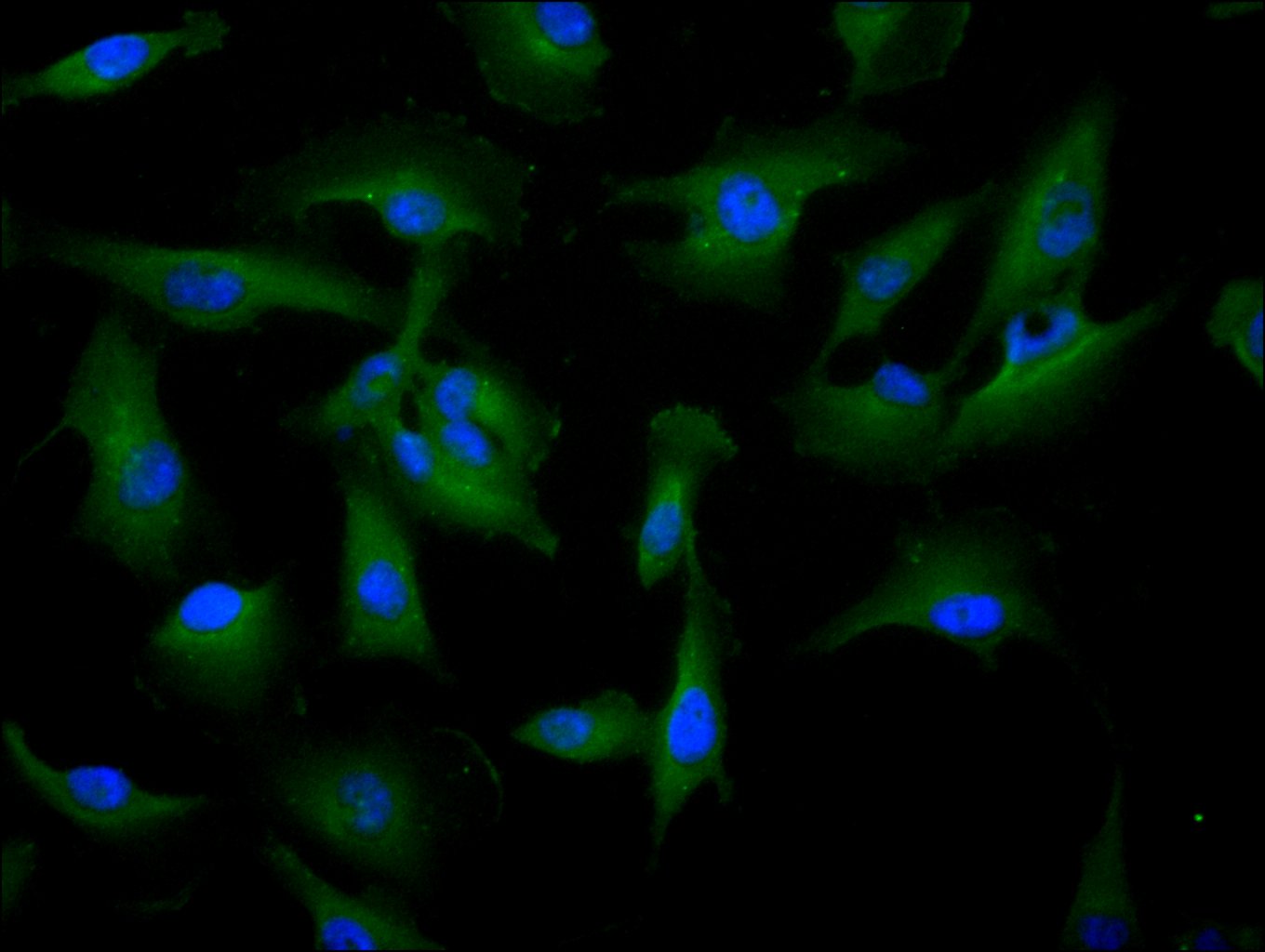 Immunofluorescence stainingof U251 cell with CSB-PA016040LA01HU at 1:20, counter-stained with DAPI. The cells were fixed in 4% formaldehyde and blocked in 10% normal Goat Serum. The cells were then incubated with the antibody overnight at 4C. The secondary antibody was Alexa Fluor 488-congugated AffiniPure Goat Anti-Rabbit IgG(H+L).
