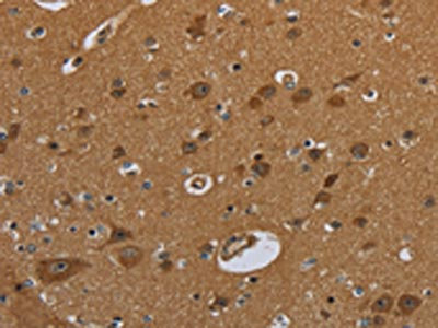 The image on the left is immunohistochemistry of paraffin-embedded Human brain tissue using CSB-PA225804(NR3C1 Antibody) at dilution 1/30, on the right is treated with fusion protein. (Original magnification: ×200)