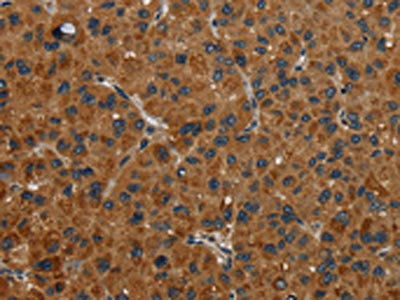 The image on the left is immunohistochemistry of paraffin-embedded Human liver cancer tissue using CSB-PA225804(NR3C1 Antibody) at dilution 1/30, on the right is treated with fusion protein. (Original magnification: ×200)